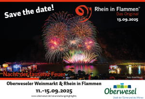 Freut euch auf 5 fröhliche Tage mit Wein, Tanz und guter Laune auf dem Marktplatz in Oberwesel – und natürlich ganz besonders auf Rhein in Flammen… einem der schönsten Feuerwerke am Rhein!