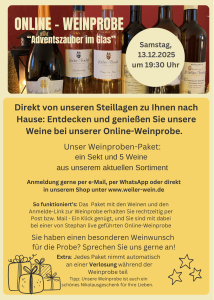 Auch in diesem Jahr gibt es wieder eine Online-Weinprobe für alle, die nicht in unseren Weinkeller kommen können oder es sich gerne in den eigenen vier Wänden in netter „Online“-Gesellschaft gemütlich machen wollen. Hier erzählen wir viel Wissenswertes aus dem Weinjahr, zu den einzelnen Weinen und wie man sie richtig probiert. Jedes bestellte Paket nimmt man an einer Verlosung während der Weinprobe teil.